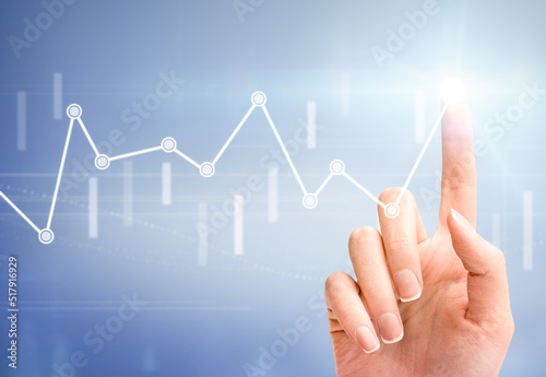 female hand touches a virtual financial graph on a light blue background