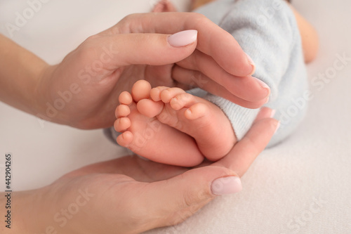 Female hands of young mother holding her newborn baby feet, closeup image with blur baby in background