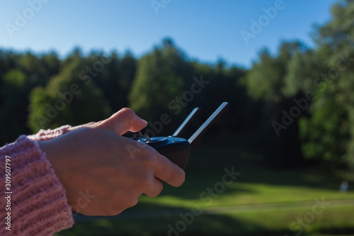 Female hands with a neat manicure hold a drone control panel with drumbo antennas and a larger display. Outdor.