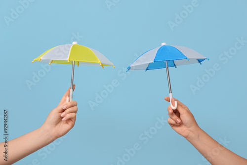 Female hands with different mini umbrellas on blue background