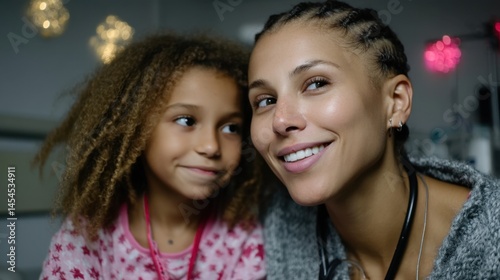 Female healthcare professional with young girl in medical setting, close-up portrait of caring and friendly atmosphere