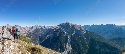Female hiker admiring view of Mittenwalder Hohenweg in summer