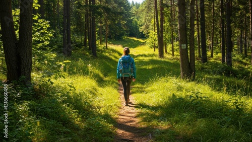 Female hiker on forest trail during sunny day, surrounded by tall trees and vibrant grass, representing adventure and connection with nature