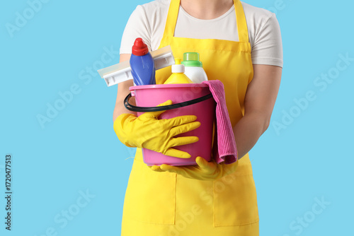 Female janitor with bucket of cleaning supplies on blue background, closeup