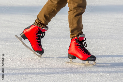 Female legs are actively skating in red skates on an ice rink. Hobbies and sports. Vacations and winter activities.