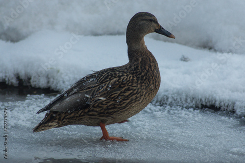 Female mallard duck standing on ice
