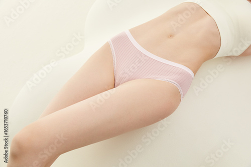 Female model in casual underwear, lying on a smooth surface.