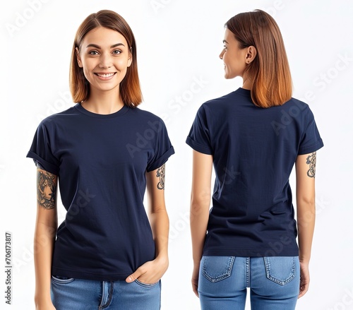 feMale model wearing a sleeves tshirt front view and back view tshirt mockup