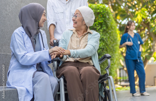 Female muslim doctor comforting elderly cancer patient in wheelchair, providing emotional support and medical care, outdoor healthcare, cancer patient care, illness support, compassionate treatment