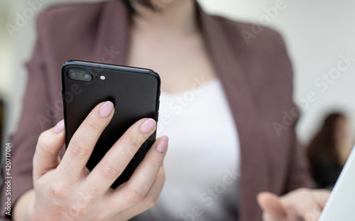 Female office worker typing on the phone, working at home office hand on keyboard close up. High quality photo