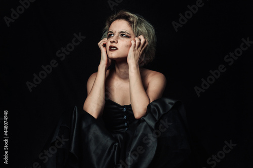 Female on a black background. Girl with smeared makeup. Girl holding her head with her hands in pain