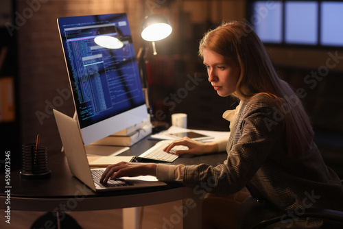 Female programmer working with laptop in office at night