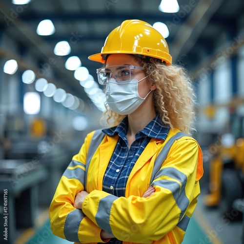 Female safety officer wearing protective gear in a factory. She stands with arms crossed. Worker inside industrial plant. Safety helmet and mask are present. The woman looks at the side.
