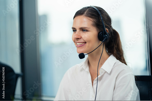 Female sales representative on the phone wearing wireless headset to work customer care and service Support office, talk and consult with customers Professional service center.
