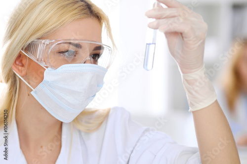 Female scientific research team with clear solution in laboratory