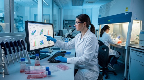 scientist, laboratory, research, biotechnology, medicals, science, experiment, computer-screen, female, professional, technology, health care, innovation, biology, chemistry, medicine, discovery, development, equipment, microscope, chart, graph, analysis, background, realistic