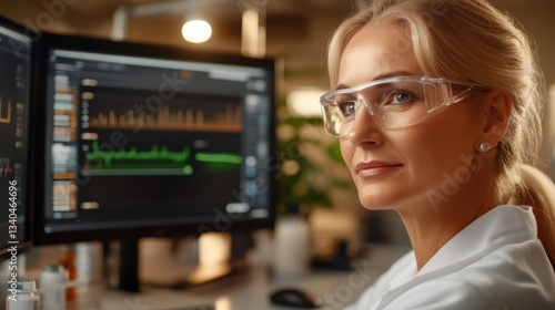Female scientist analyzing data on computer screens.