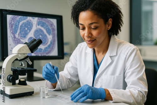 Female scientist analyzing microscope slide in laboratory with digital histology image on screen in background, wearing gloves and lab coat. Ai generative