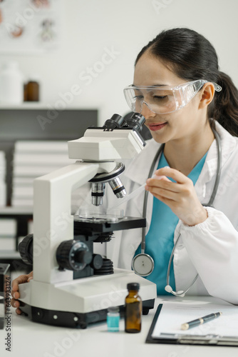 Female scientist researcher conducting an experiment working in the chemical laboratory.