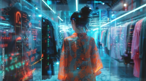 Female shopping in virtual reality world. Futuristic shopping concept.