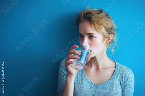Female sipping chilled water bright blue backdrop