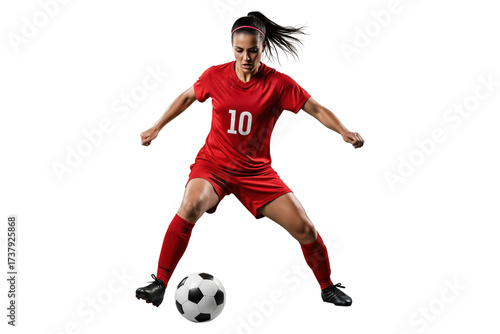 soccer, football, player, female, woman, controlling, ball, dribbling, kick, sport, action, athlete, competition, game, energy, strong, uniform, red, sharpened, concentration, determination, dynamic, studio, full body