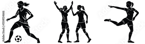 soccer player, woman, silhouette, vector, sport, female, football, team, athletic, action, competition, game, design, illustration, cut-out, exercise, health, activity, training, black-and-white, uniform, goal, celebrate, high five, kick, dribbling, isolated, graphic