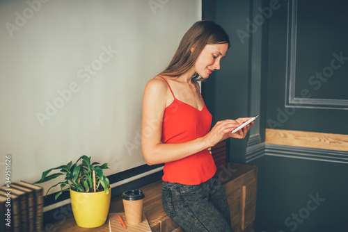 woman, tablet, classroom, student, smile, using, study, university, education, break, female, casual attire, young, plant, pot, drink, beverage, to go, take-away, hot drink, tea, lady, glad, pleased, lesson, rest, relax, device, contraption, online, cyberspace, browsing, surfing, watching, app, cognition, wisdom, learn, connection, horizontal, indoor, copy space