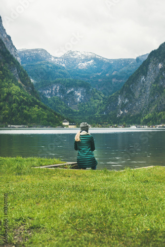 Female traveller in warm clothes from back, sitting at mountain lake coast enjoying the view of the Alps in Austria. Freedom concept