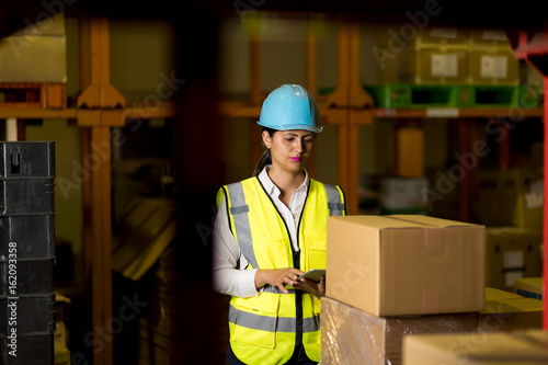 female, woman, person, people, business, men at work, labor, job, industry, logistic, distribution, center, delivery, check, box, cargo, storehouse, stock, depot, inventory, control, stocktaking, inspection, safe, safety, vest, clothes, technology, factory, manufacturing, production, store, commerce, brazil, indian, brazilian, immigrant, middle, freight, good, tablet, list, portable, terminal, wireless, communication, helmet