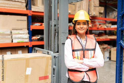 female, employee, smiling, portrait, arms crossed, forklift, rack, warehouse, cardboard, box, supervisor, factory, confident, men at work, safety, industrial, copy space, vest, standing, casual attire, machinery, front view, security, looking, helmet, occupation, working, indoor, 1, person, adult, woman, 20s, young, latin, hispanic