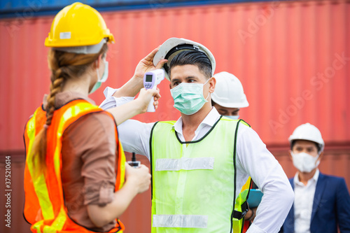 Female worker scanning fever temperature with digital thermometer to construction site staff wearing hygiene face mask protect from Coronavirus or COVID-19. New Normal working life adaptation in 2020