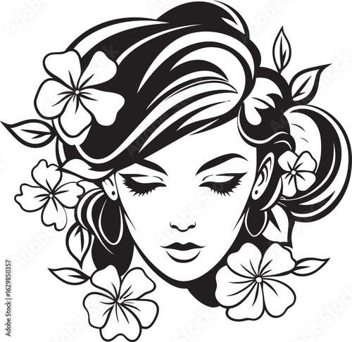 Feminine Portrait and Petal Highlights Vector Black Logo Artistic Woman Face with Blossoming Petals Vector Black Icon