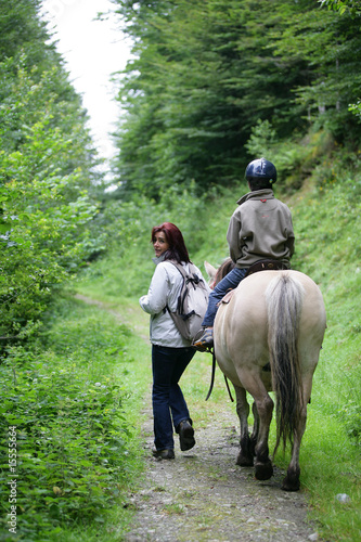 Femme marchant près d'un enfant assis sur un poney
