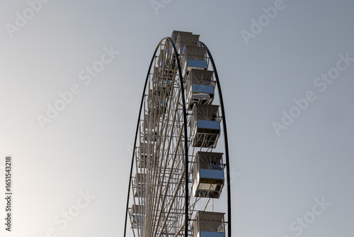 ferris wheel, amusement park, carnival, funfair, entertainment, recreation, leisure, travel, tour tourism, adventure, excitement, joy, childhood, summer, holiday, vacation, family, friends, fun, ride, attraction, gondola, cabin, wheel, sky, cloud, blue, white, metal, steel, structure, engineering, design, architecture, perspective, sunny, daytime, outdoors, copy space, background, nobody, vertical