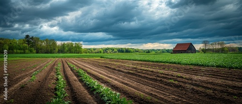 farmland, fertile, dirtied, crop, agriculture, cloudy, sky, nature, rural, green, landscape, farm, tree, growth, weather, row, plant, field, ground, environment, scene, horizon, vibrant, spring, land, farming, paddock, texture, countryside, planting, rural area, rustic, pasture, vegetation, earth, calmness, serene, pastoral