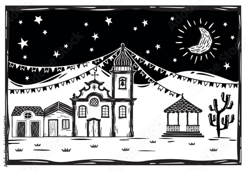 Festa Junina in northeastern Brazil. Village of houses, church and bandstand under the starry sky. Woodcut vector, cordel style