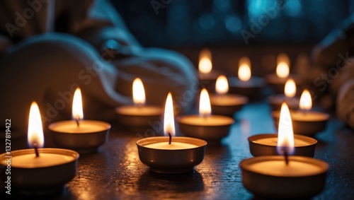 Festive background with a burning candle, a photo reflecting mourning through fire.