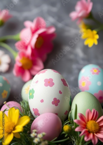 Festive background with funny easter eggs and spring flowers on gray background copy space easter egg holiday illustration celebration easter