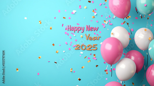 Festive balloons in pink, white, and blue against a bright backdrop, celebrating New Year 2025 with confetti, creating a joyful atmosphere for celebrations.