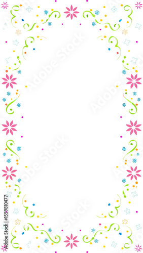border, frame, decoration, celebration, party, invitation, greeting, card, birthday, anniversary, festive, colourful, floral, flower, pink, blue, tan, green, swirl, confetti, dot, playful, whimsical, design, element, graphic, illustration, background, template, copy, space, empty, vertical, spring, summer, joyful, happy, vibrant, cute, simple, pattern