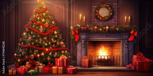 Festive Christmas backdrop with tree, presents, and fireplace