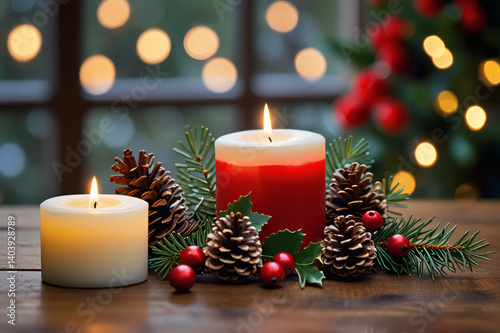 christmas, candle, red candle, pine cone, holly berries, evergreen, winter, holiday, festive, decoration, light, bokeh, warm, cosy, romantic, celebration, season, christmas, holiday season, christmas, christmas decoration, candlelight, home decor, wooden table, background, blurred background, out of focus, still life