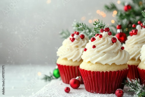 cupcake, cupcake, frosting, white, red, berry, christmas, holiday, festive, dessert, sugar, sweet, treat, snow, sprinkle, sprinkle, winter, december, celebration, party, ornament, ornament, christmas tree, pine, needle, green, background, bakery, delicious, deliciously, tasty, delight, confectionery, confection, baking, food