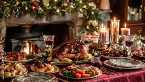 Festive Christmas Dinner Table Setting with Roasted Turkey and Decorations.