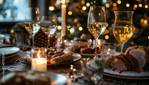 luxurious, occasion, cheer, gathering, feast, sparkling, twinkle, merry, light, warm, wine, bokeh, joy, seasonal, festive, party, elegant, inviting, meat, ambience, christmas, glassware, candle, fruit, cosy, decoration, plate, family, cutlery, culinary, ham, sausage, epicure, holiday, decorative, celebration, meal, christmas, bright, food, dinner, traditional, table, winter, delicious, revelry