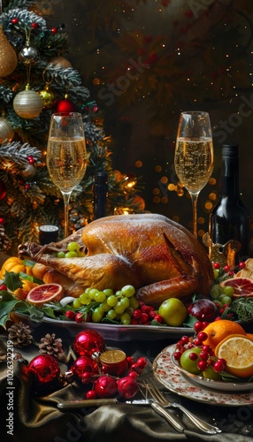 Festive christmas dinner table with roasted turkey, colorful sides, and sparkling wine