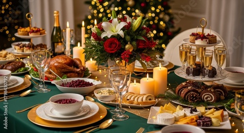 christmas dinner, champaign, candlelight, christmas tree, celebration, gourmet food, fine dining, winter holiday, special occasion, dining room, table setting, appetiser, dessert, cheeseboard, wine glass, tradition, new year's eve, party food, upscale, home decor, food photography, still life, abundance, generosity, richness, entertainment
