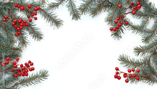Festive Christmas frame made of coniferous branches decorated with artificial red berries. Frame isolated on white background, copy space. Two options, with and without decoration.