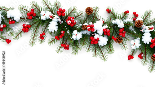 christmas, garland, holiday, festive, decoration, border, frame, winter, evergreen, pine, fir, branch, red berry, holly, snow, snowflake, snow-covered, pine cone, natural, nature, white background, copy space, christmas tree, seasons greetings, celebration